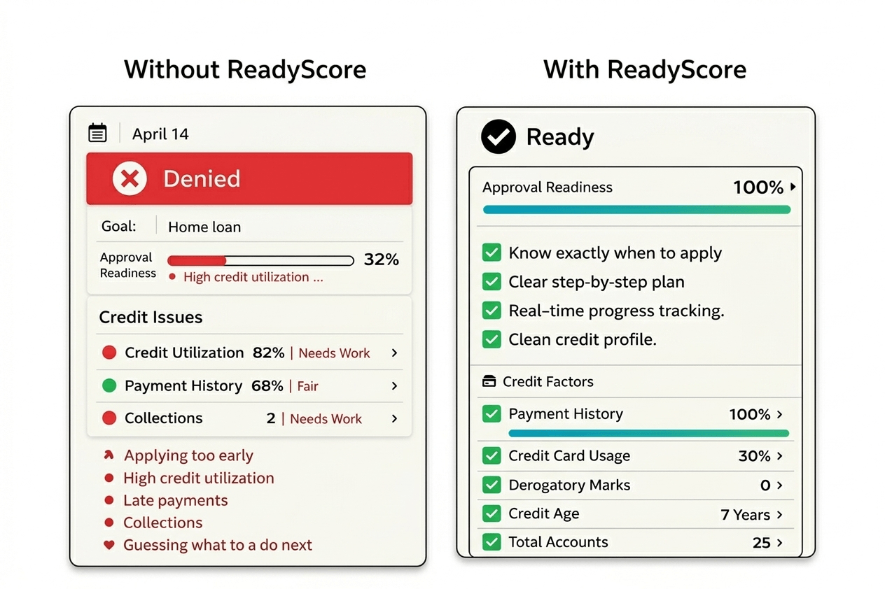 The ReadyScore is a tool to help you avoid 'hard inquiries' that lead to denials, which can further damage your score. While you are always free to apply whenever you choose, we recommend waiting until our system shows a high approval probability. This protects your credit profile and ensures you aren't wasting time on applications that aren't ready to clear.